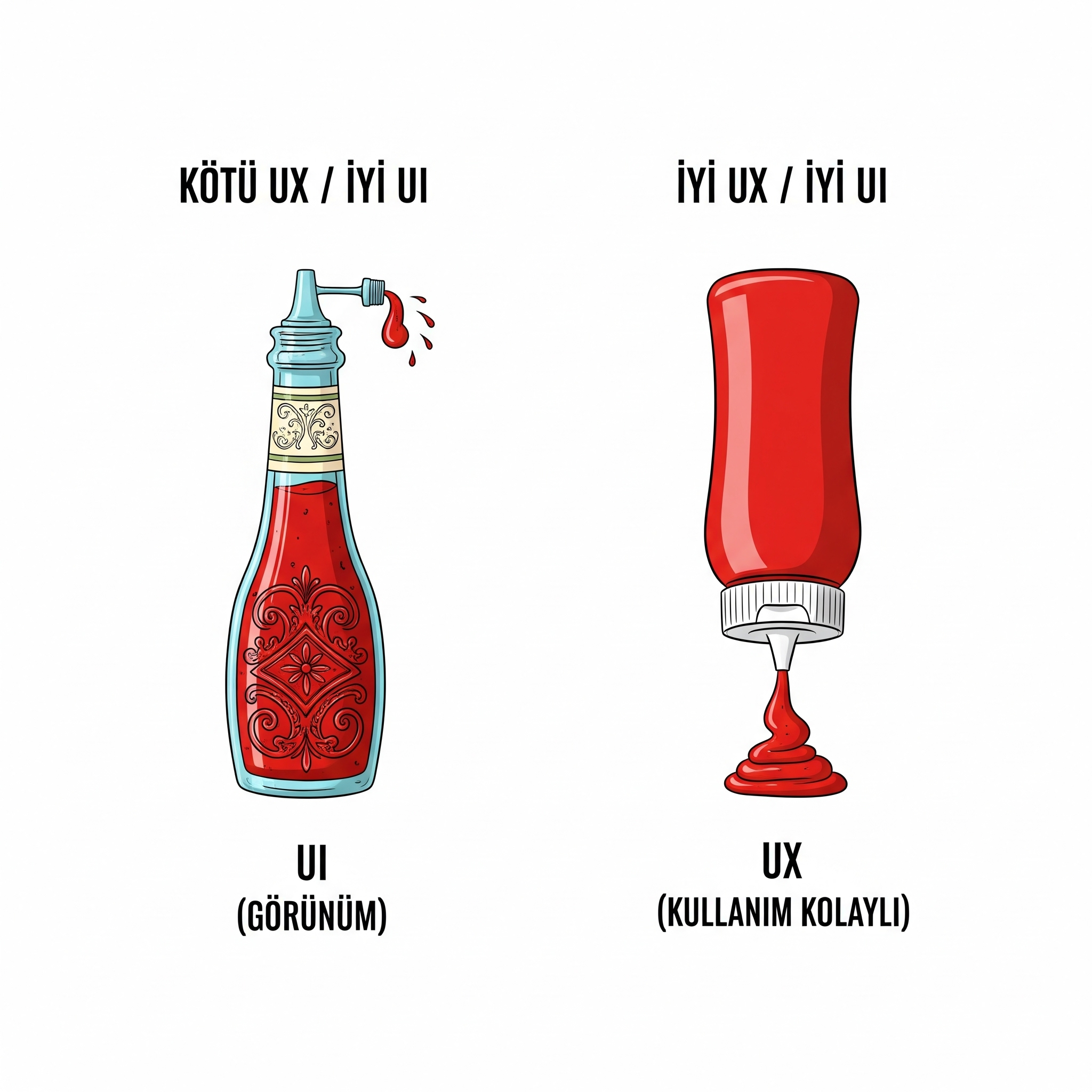 Harika bir UX'e sahip ancak kötü bir UI'a sahip bir ürün, kullanışlı olsa bile kimsenin kullanmak istemeyeceği kadar çirkin ve sıkıcı olabilir. Tam tersi, büyüleyici bir UI'a sahip ancak temelinde yatan UX'in zayıf olduğu bir ürün ise, kullanıcının hedefine ulaşmasını engelleyen, sinir bozucu bir deneyim sunar.